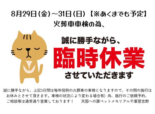 2025/08/27天国への扉ペットメモリアル千葉習志野から臨時休業のお知らせです! いつも天国への扉ペットメモリアル千葉習志野をご利用頂きまして、誠に有難うございます。 8... -