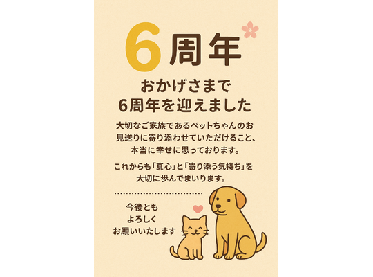 2025/09/08おかげさまでペット訪問火葬・天国への扉ペットメモリアル千葉習志野は、本日で丸6周年を迎えることができました。 これもひとえに、大切なご家族であるペットちゃん... -