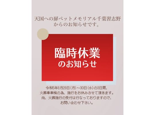 いつも天国への扉ペットメモリアル千葉習志野のSNSをご覧頂き、誠にありがとうございます。 天国への扉ペットメモリアル千葉習志野より臨時休業のお知らせのお知らせ...