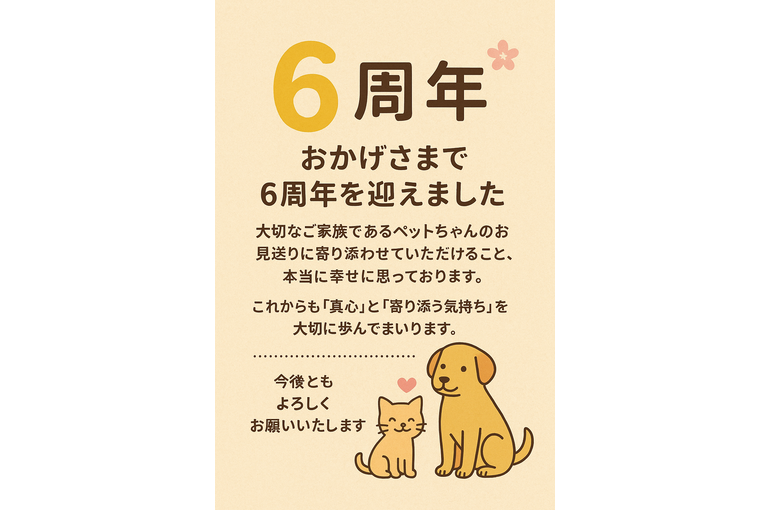 おかげさまでペット訪問火葬・天国への扉ペットメモリアル千葉習志野は、本日で丸6周年を迎えることができました。