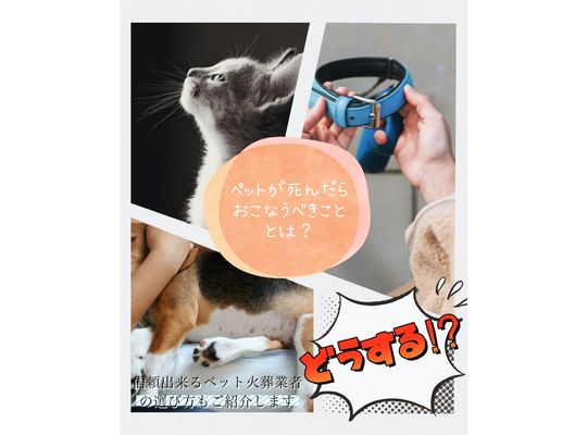 2023/03/12ペットが死んだらおこなうべきこととは?信頼できるペット火葬業者の選び方もご紹介します もし最愛のペットが亡くなってしまったら、まずおこなうべきことがあ... -